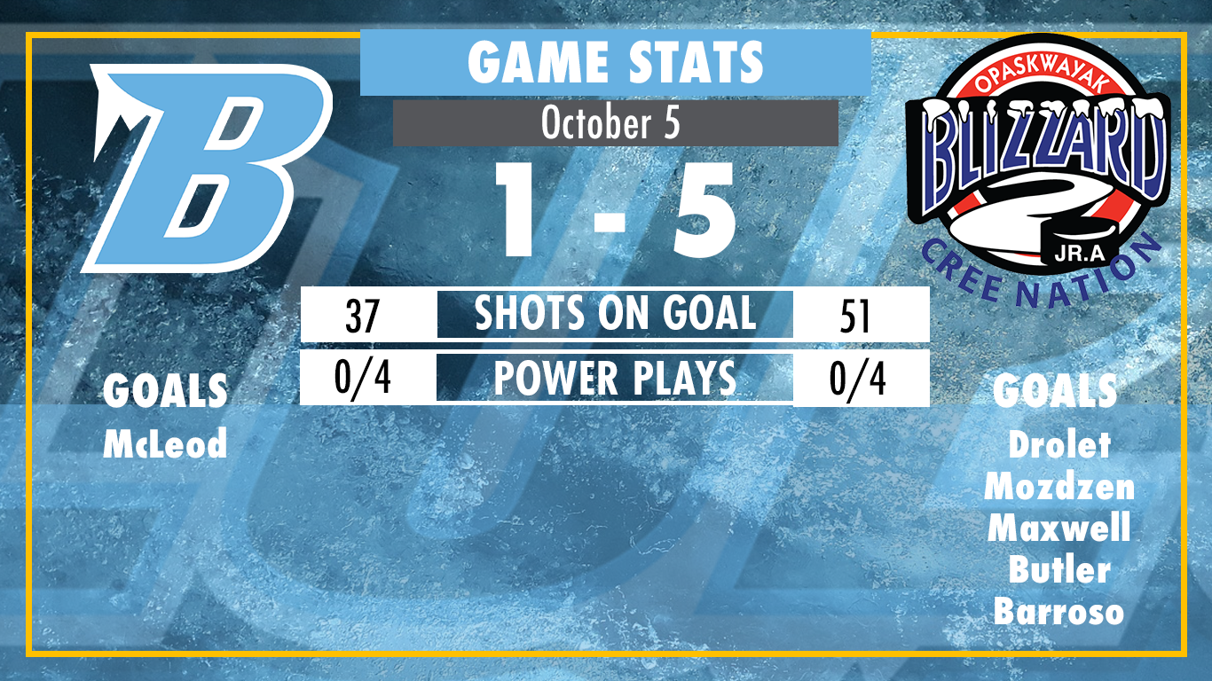 The Blizzard received goals from Adam Drolet, Dustin Mozdzen, James Maxwell, Ryan Butler and Riley Barroso. Cory Checco registered three assists in the game. Goaltender Zack Cloutier stopped 37-of-38 shots.